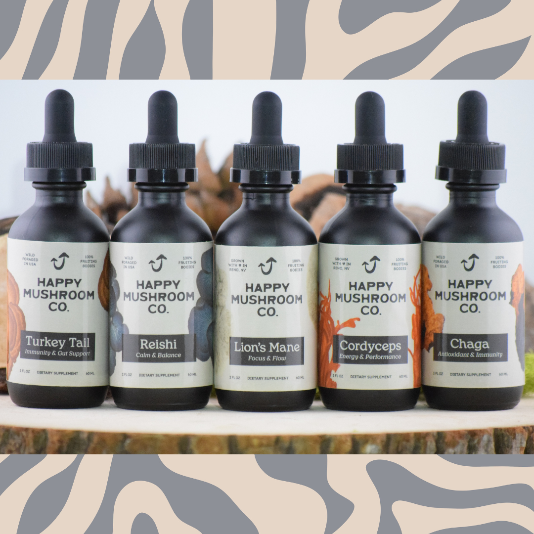 All five Happy Mushroom tinctures for balanced full body and mind support